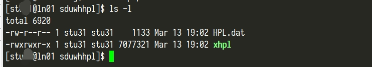 201800xxxxxx/hpl-2.3/bin/sduwhhpl下,有HPL.dat和xhpl两个文件,表示HPL编译成功目录